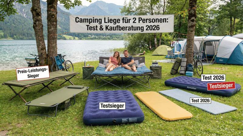 Das Bild zeigt einen Vergleich verschiedener Campingliegen und Schlaflösungen für zwei Personen in einer naturnahen Campingumgebung am See. Im Mittelpunkt sitzt ein Paar auf einer Doppelliege, umgeben von unterschiedlichen Campingbetten, Luftmatratzen und Isomatten, die mit Hinweisen wie „Testsieger“, „Preis-Leistungs-Sieger“ und „Test 2026“ gekennzeichnet sind. Zelte, Fahrräder und Campingausrüstung im Hintergrund unterstreichen den Outdoor-Kontext. Die Szene eignet sich ideal zur Illustration eines Tests und einer Kaufberatung für Campingliegen für 2 Personen im Jahr 2026, inklusive Komfort-, Stabilitäts- und Preisvergleich.