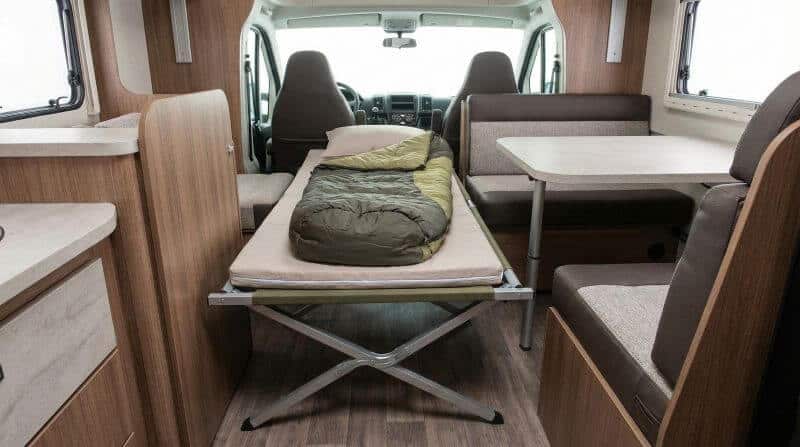 Das Bild zeigt den Innenraum eines Wohnmobils, in dem ein Campingbett/Feldbett als zusätzliches Schlafbett aufgebaut ist. Auf dem Bett liegt ein Schlafsack, während im Hintergrund die Sitzgruppe mit Tisch zu sehen ist. Die Szene veranschaulicht, wie sich ein mobiles Zusatzbett im Camper oder Van nutzen lässt, um zusätzlichen Schlafplatz zu schaffen. Ideal zur Illustration eines Ratgebers zu Campingbetten im Wohnmobil, Platzoptimierung und Schlafkomfort beim Camping.